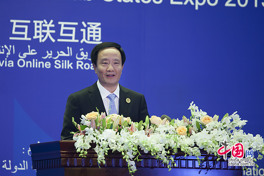 10日下午,2015中国—阿拉伯国家博览会网上丝绸之路论坛在宁夏回族自治区银川市宁夏国际会堂举行,论坛主题为“网上丝路·互联互通”。图为宁夏回族自治区党委书记李建华致辞。中国网记者 张若梦 摄