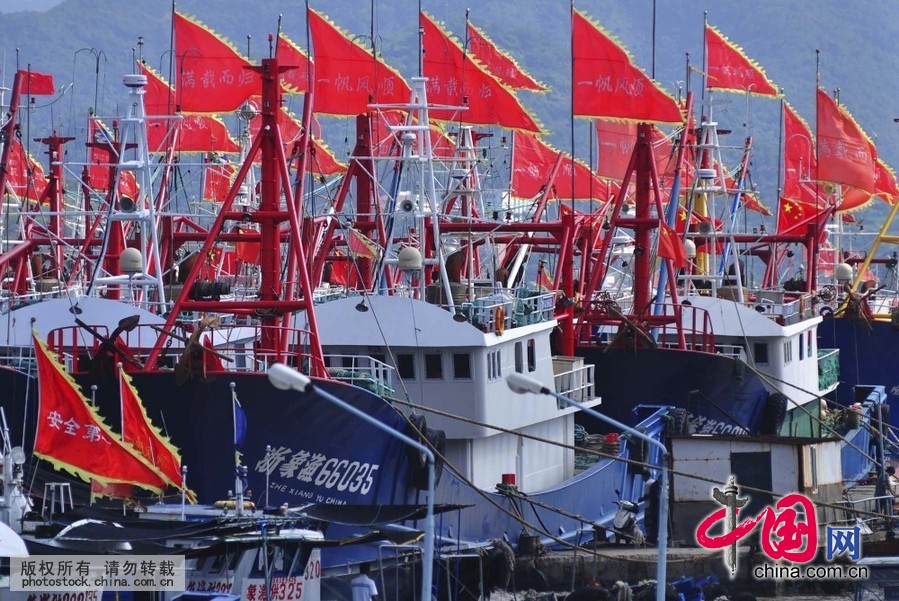 象山县石浦港内准备出海捕渔的渔船上飘扬着各种吉祥语的红旗(摄影 中国网图片库/胡学军)