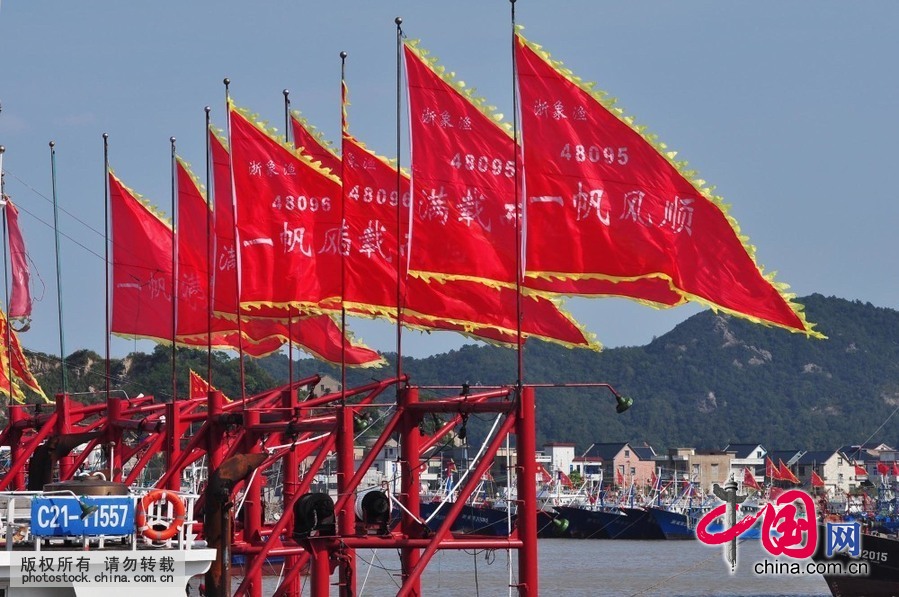 象山县石浦港内准备出海捕渔的渔船上飘扬着各种吉祥语的红旗(摄影 中国网图片库/胡学军