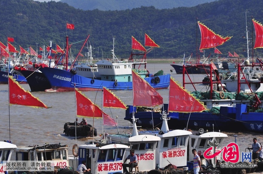 象山县石浦港内准备出海捕渔的渔船上飘扬着各种吉祥语的红旗(摄影 中国网图片库/胡学军)