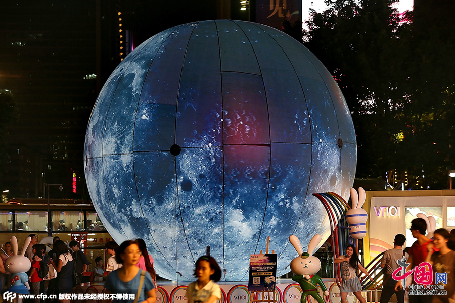 2015年9月26日,广东广州,一个造型逼真的巨大人造月球竖立在天河维多利亚广场上,为中秋添加浓浓的节日气氛,吸引了无数市民观赏拍照。