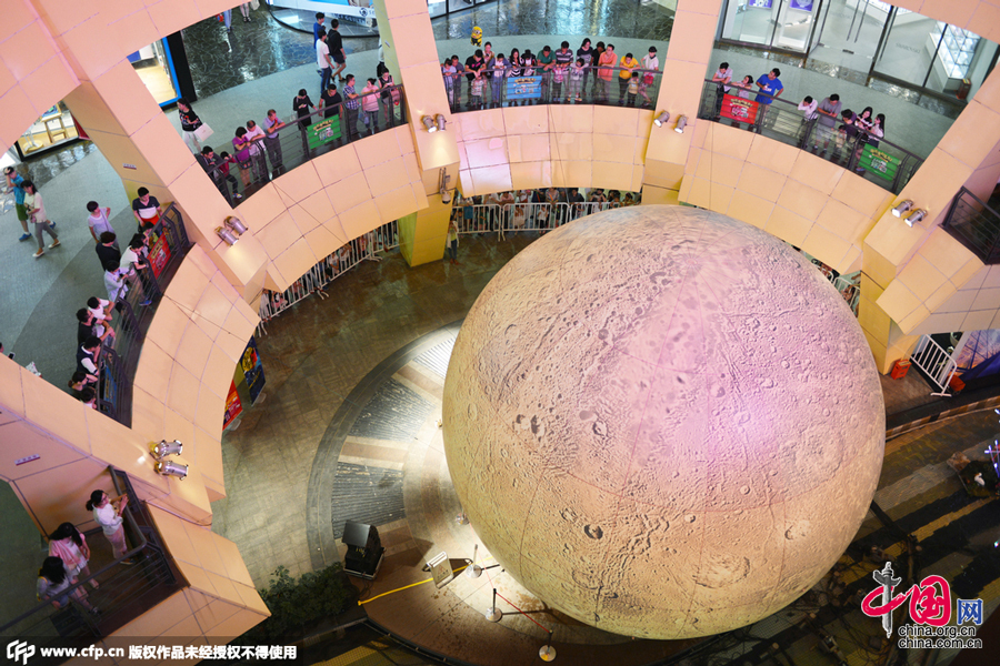 2015年09月26日,江苏省南京市,南京市水游城内竖立起一个高约十米的巨型“圆月”,周围由六根绳索斜拉固定,引起众多市民纷纷掏出手机拍照留念,为2015羊年中秋增添了浓浓的团圆氛围。图片:方东旭/CFP