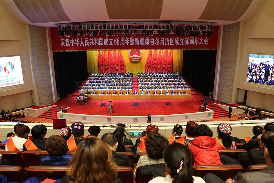 10月1日,庆祝中华人民共和国成立66周年暨新疆维吾尔自治区成立60周年大会将在新疆人民会堂举行。图为大会现场。中国网记者 董宁摄影
