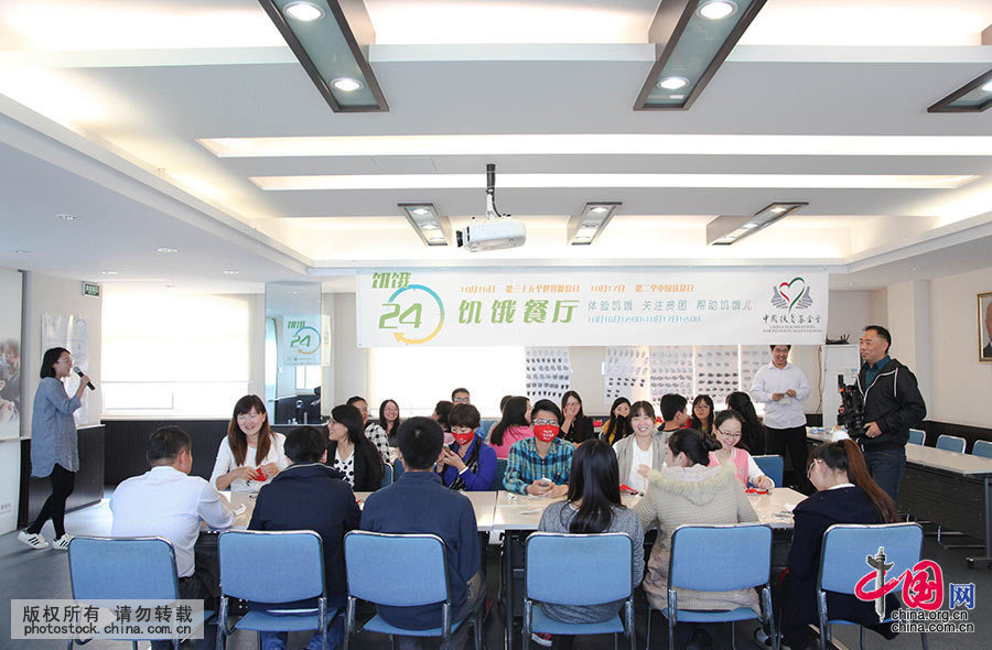 2015年10月16日,中国扶贫基金会联合多家媒体共同发起的“饥饿24小时公益体验活动”重要活动之一饥饿餐厅在中国扶贫基金会“开张”。图为活动体验者就坐。中国网记者 伦晓璇 摄
