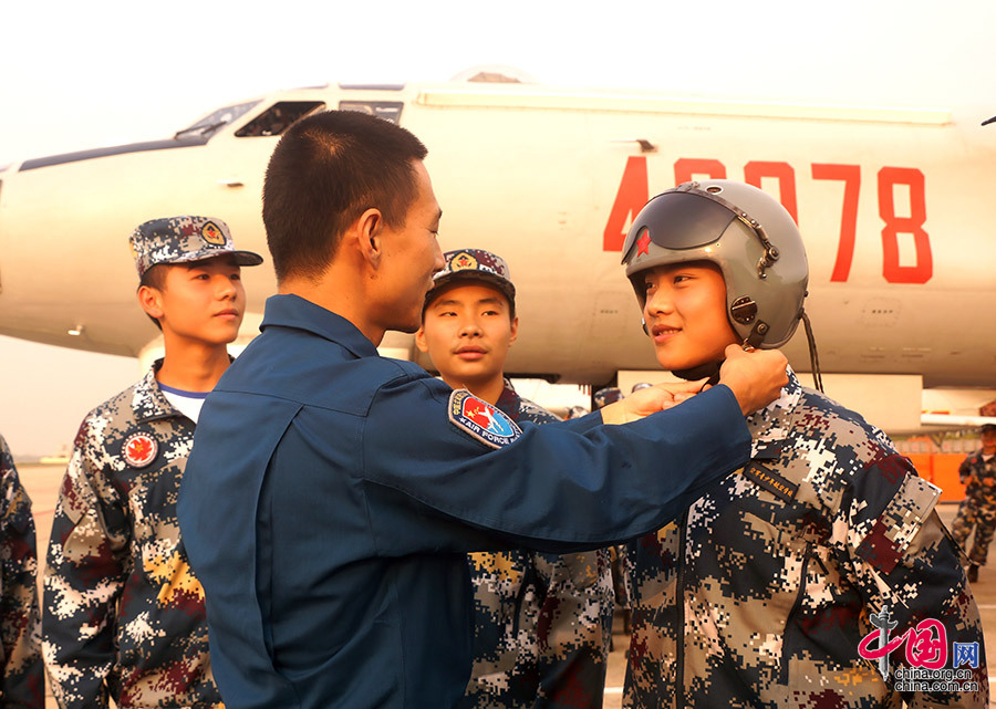 10月17日,空军青少年航空学校西安中学航空实验班学生,参观空军航空兵某团,图为飞行员给学生马晓辰试戴飞行头盔。申进科 摄