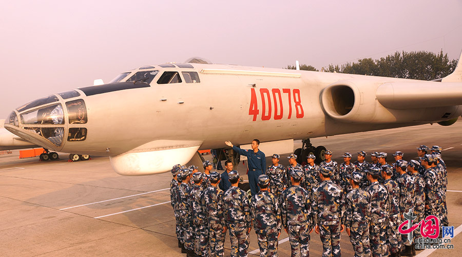 10月17日,空军青少年航空学校西安中学航空实验班学生,参观空军航空兵某团,图为飞行员向学生介绍某型轰炸机。申进科 摄