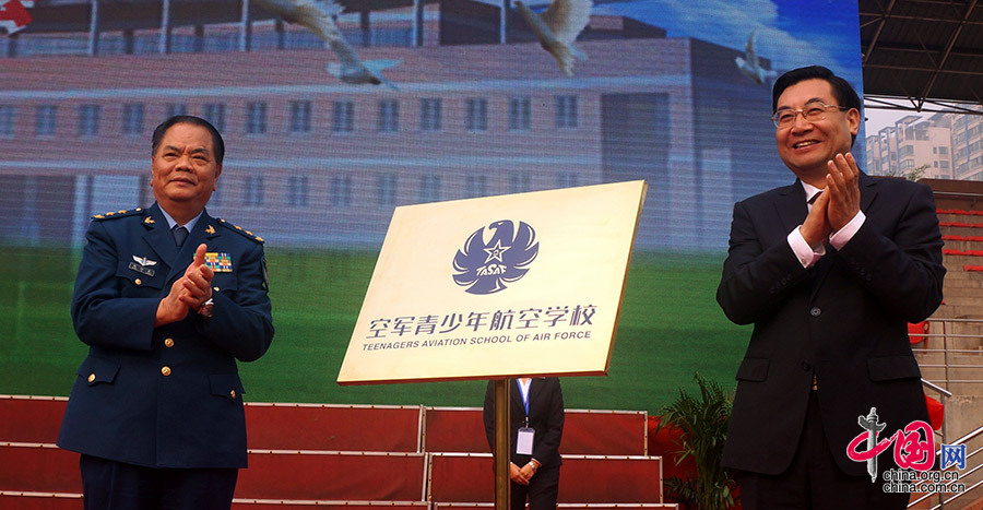 空军和陕西省10月18日在西安中学共同举行仪式,欢迎110名优秀少年成为空军青少年航空学校航空实验班学生。图为空军副政委赵以良中将和陕西省委副书记胡和平,共同见证这一强军大事。申进科 摄