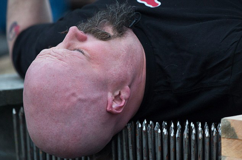特技演员躺钉床被70辆摩托车辗过 刷新世界纪录[组图]
