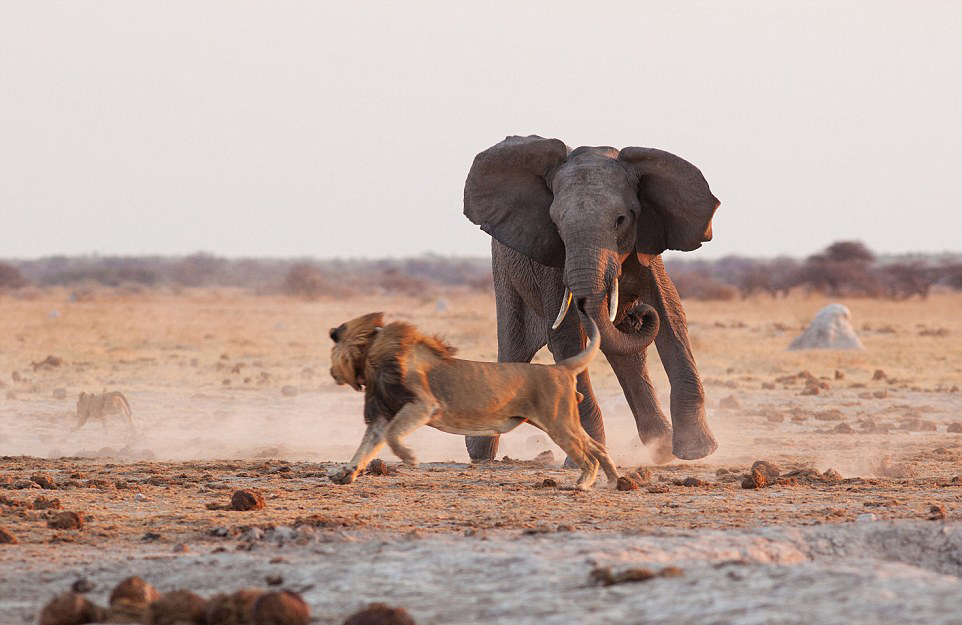 国际在线专稿:据英国《每日邮报》11月11日报道,捷克摄影师简·赫尔巴塞克(Jan Hrbacek)日前在非洲博茨瓦纳的纳塞潘(Nxai Pan)国家公园拍摄到惊险一幕:一头雄狮与一头年轻公象为争夺水源展开激战。