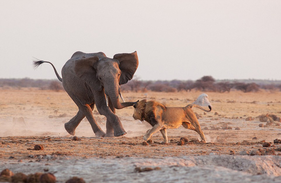 非洲大草原上演雄狮大象争水大战[组图]