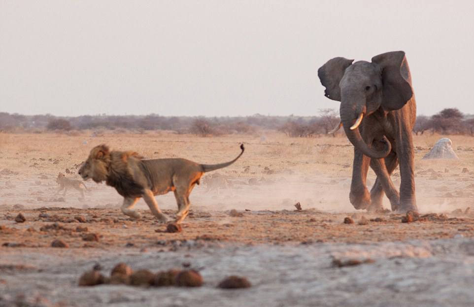 雄狮被迫采取了某些避让措施,但最终抵御住公象的进攻,并最终迫使其后退。(网页截图)