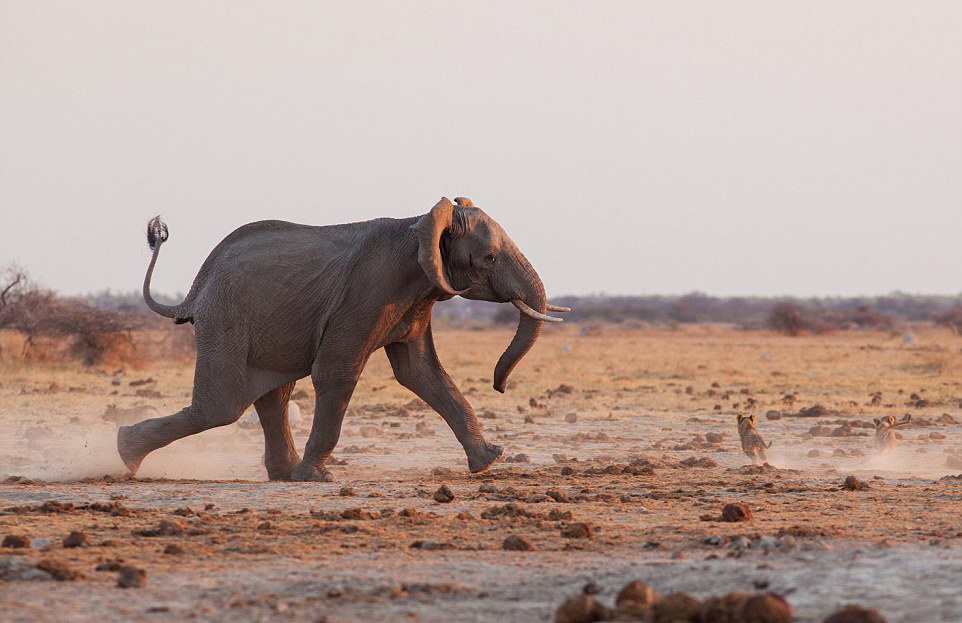 当大象接近水坑时,两只幼狮仓皇而逃。(网页截图)