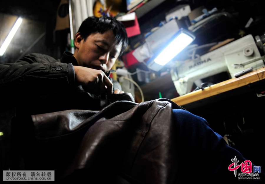 一款上世纪80年代的皮大衣,经过“医生”的巧手,在短短1个小时内,变成了一款时髦的夹克。中国网图片库 王伟 摄