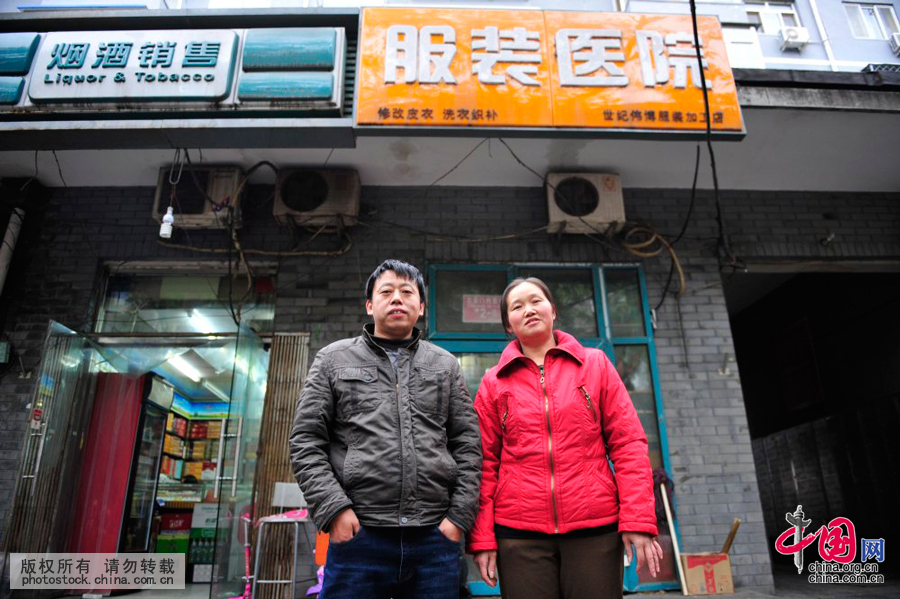 季国军、朱美夫妇在他们的“服装医院”前合影。