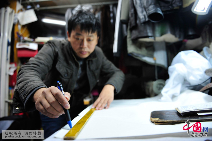 国军师傅在制作一件皮衣前,绘制手稿。