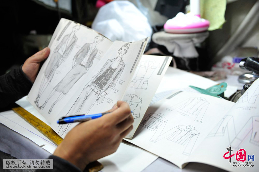 季国军师傅在制作一件皮衣前,绘制手稿。