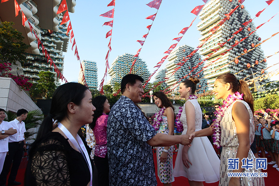 三亚市常务副市长岳进与世界小姐一一握手。陈文武摄