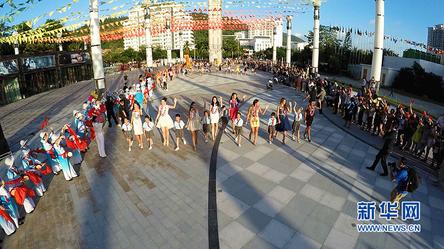 世界小姐步入三亚时代广场。新华网航拍队 摄