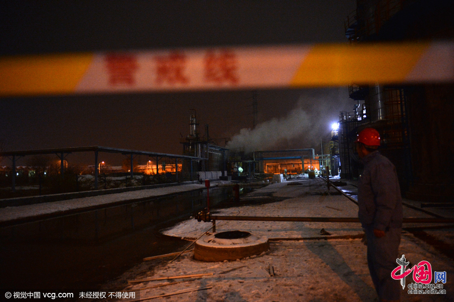 2015年11月25日,河北石家庄,发生爆裂的双氧水装置纯化吸附塔,现场已经设立警戒线,并没有明火,无刺鼻气味。图片来源/视觉中国