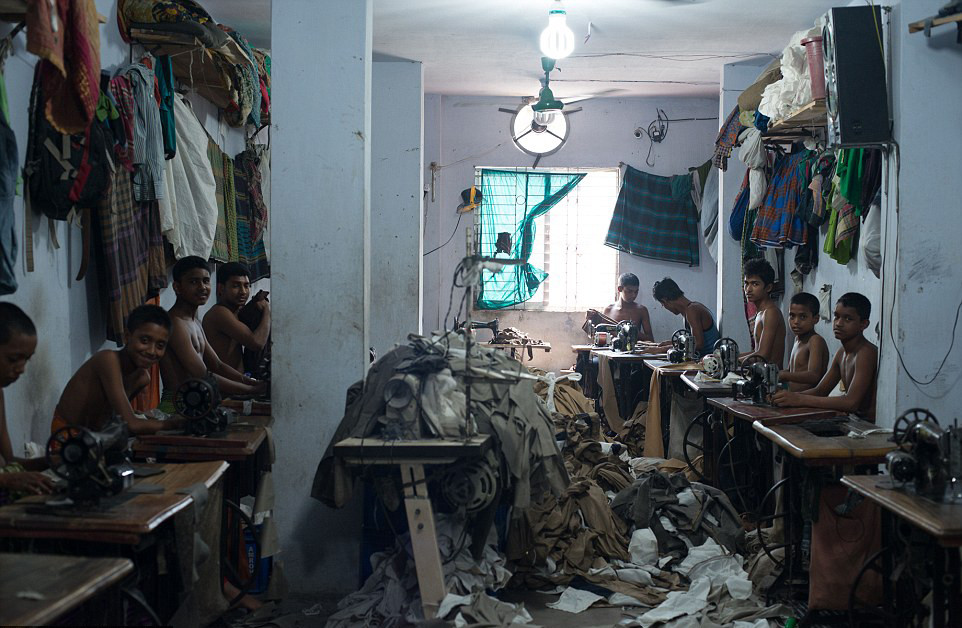 国际在线专稿:据英国《每日邮报》11月30日报道,摄影师克劳迪奥·蒙特萨诺·卡西拉斯(Claudio Montesano Casillas)日前走进位于孟加拉国首都达卡的服装工厂,拍摄了数千童工的真实生活。这些工厂没有营业规范,童工每天工资大约20便士(约合人民币2元)。他们吃饭、洗澡、睡觉都在工厂内,每周只有半天的休息时间。