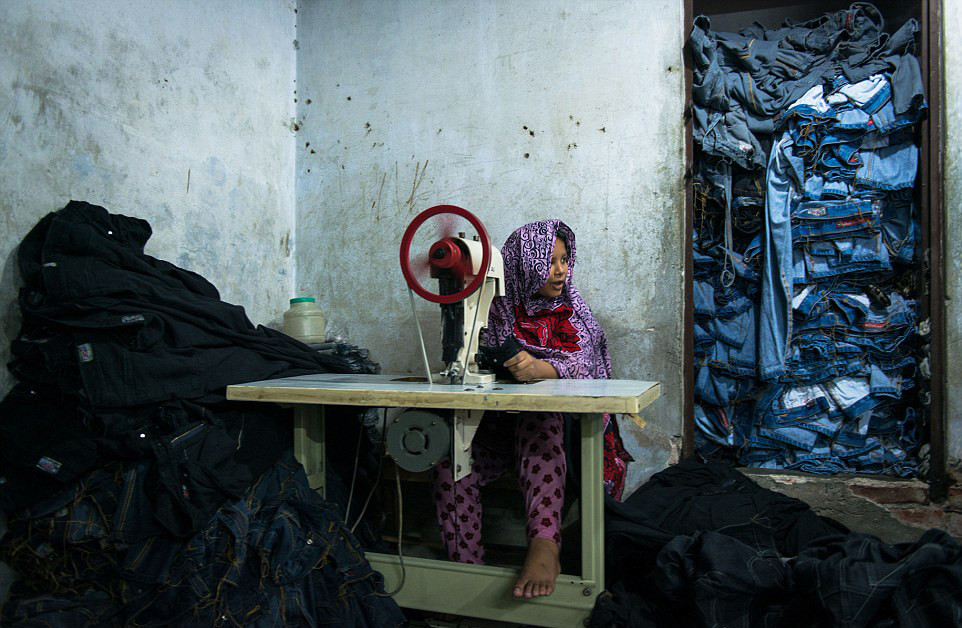 一个孩子坐在自己的工作台前,负责从蓝色牛仔裤中拆除额外的针线。(网页截图)
