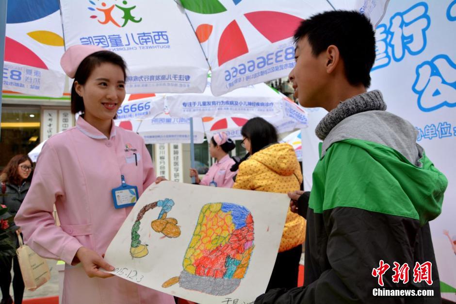 一位孩子将自己现场作品送给了护士。这位孩子的妈妈说,以前上班时发现孩子对画画有特殊爱好,他能够安静地完成自己的作品。 胡敏 摄