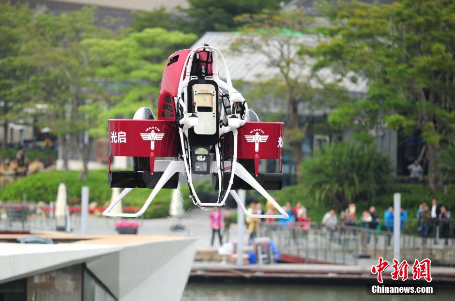 12月6日下午,深圳光启“未来飞行秀”飞行包震撼上演,由澳洲皇家飞行员驾驶着飞行包在深圳欢乐海岸做载人飞行和无人飞行,这是光启飞行包在中国境内的首次飞行。现场,光启与商家代表签约100台飞行包,同时还宣布成立钢铁侠俱乐部。飞行包可用于应急救援、公安、消防、旅游等领域。图为无人驾驶飞行包在低空飞行。中新社记者陈文 摄