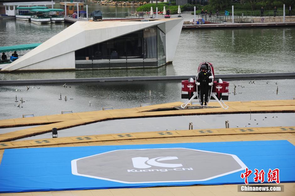 12月6日下午,深圳光启“未来飞行秀”飞行包震撼上演,由澳洲皇家飞行员驾驶着飞行包在深圳欢乐海岸做载人飞行和无人飞行,这是光启飞行包在中国境内的首次飞行。现场,光启与商家代表签约100台飞行包,同时还宣布成立钢铁侠俱乐部。飞行包可用于应急救援、公安、消防、旅游等领域。图为飞行员驾驶飞行包超低空飞行。中新社记者陈文 摄