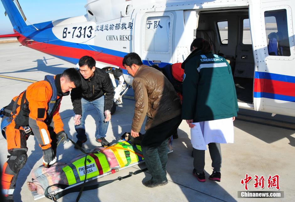 12月6日,在辽宁省大连市正东55海里海域处,“辽大甘渔15216”渔船上1名断腿渔民急需救助。与此同时,位于山东省威海市正北30海里海域处的“丹渔捕5081”渔船上,也有一名受伤渔民需要救援。交通运输部北海第一救助飞行队派出专业救助直升机,先后将两名重伤渔民救起并转移至陆地。目前,两名伤者仍在医院接受治疗。李文侠 摄