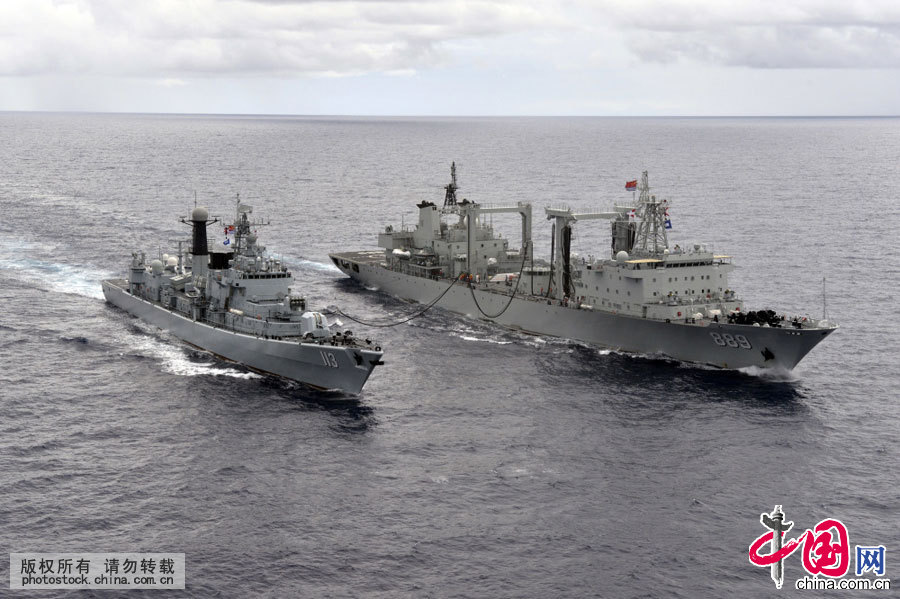太湖舰为青岛舰进行横向油水补给。中国网图片库 张海龙摄影
