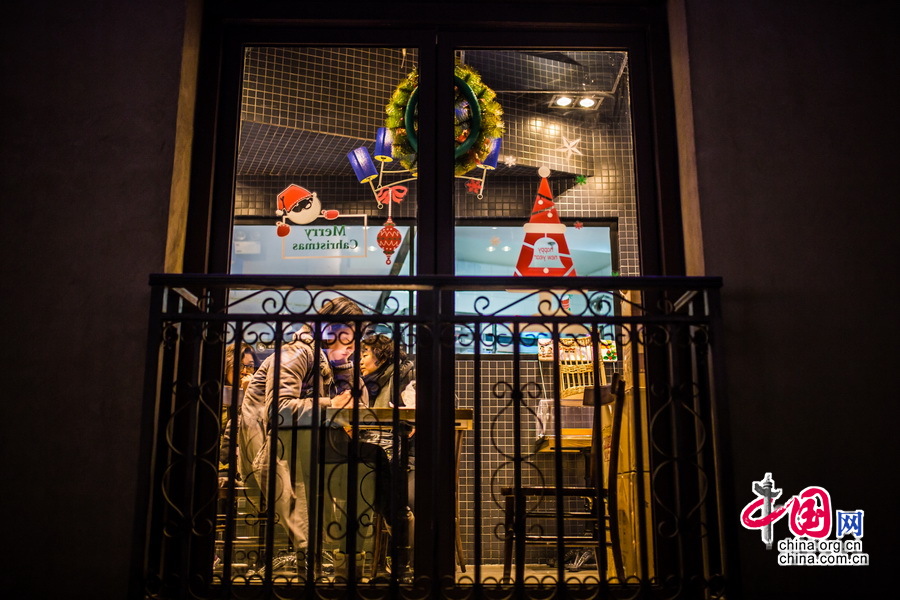 圣诞节期间各类餐饮店的窗户上也布满圣诞元素吸引食客。中国网 郑亮摄影