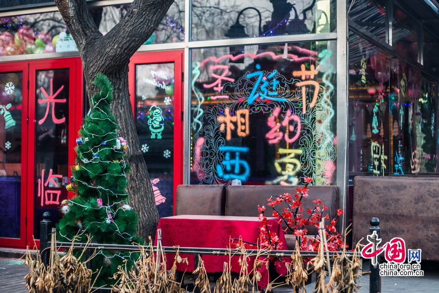 北京著名的酒吧街,虽然白天并不是营业的高峰,但是各类圣诞主题的装饰也非常显眼。中国网 郑亮摄影