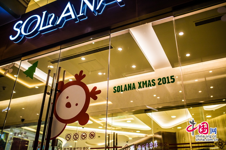 商店大门上贴着可爱的圣诞主日贴画。中国网 郑亮摄影