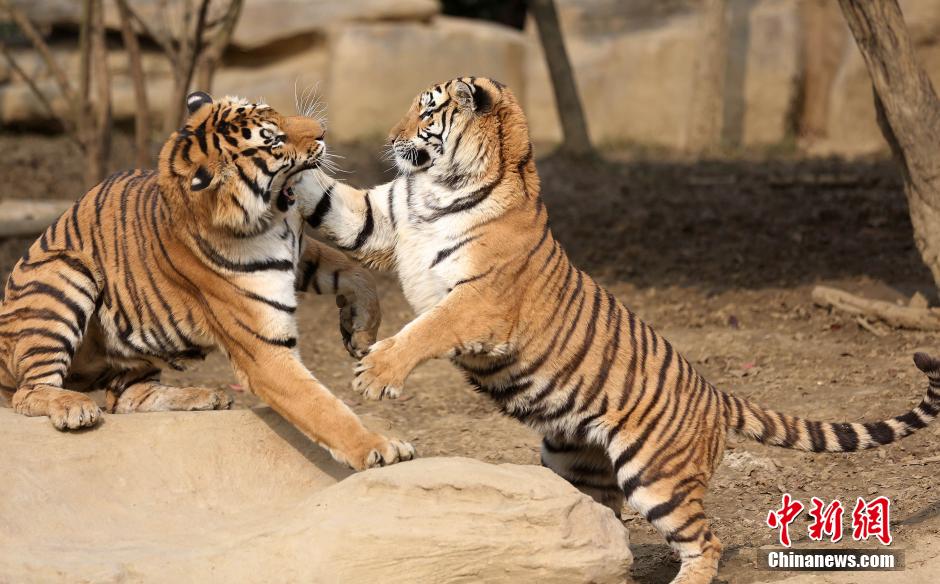 12月28日,生活在常州淹城野生动物世界散养区内的两只老虎在阳光下你来我往“比武”,一招一式颇有“动作片”的味道。中新社记者 泱波摄