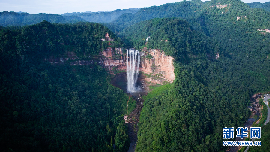 重庆市江津区四面山望乡台瀑布,在航拍视角下的望乡台瀑布,犹如从“绿海”中涌出的一条“银缎”,在阳光的照射下显得光彩四溢。