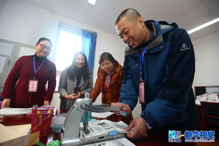 1月12日,家长在为期末考卷装订打孔。新华网发(刘东岳摄)