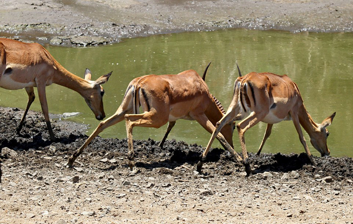 据悉,近日南非克鲁格国家公园气温高达40℃,且极其干旱。饥渴难耐的黑斑羚群冒着生命危险到鳄鱼主宰的小水坑,准备一饮解渴。成年黑斑羚谨慎小心,步步为营,生怕落入鳄鱼的圈套。但一只幼年黑斑羚惬意饮水时,并未意识到危险正步步向它逼近,随后一只鳄鱼张开血盆大口向它袭去。所幸而小黑斑羚动作敏捷,逃过一劫,旁边母黑斑羚咩咩直叫呼唤着孩子回到自己身边。