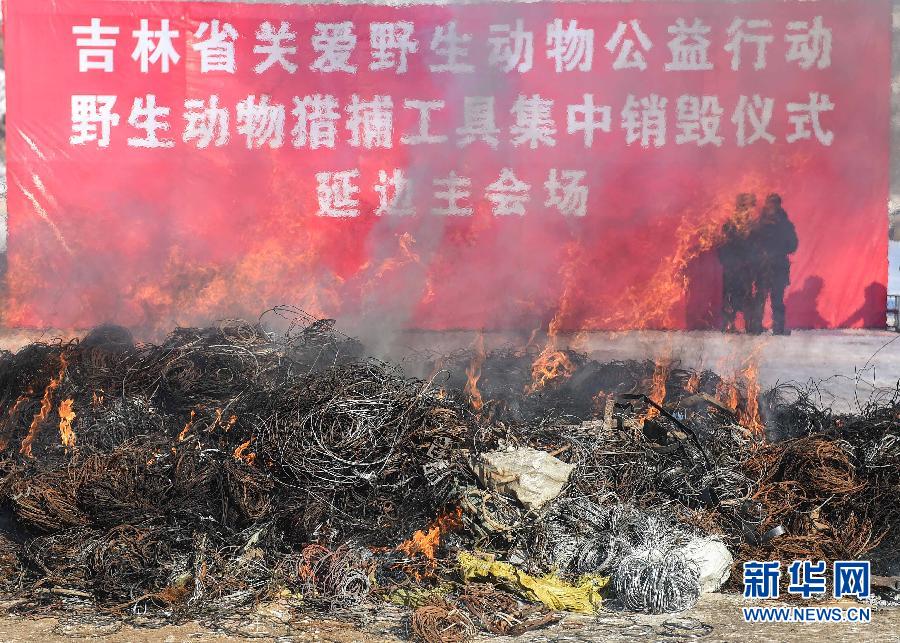 1月25日,在吉林省野生动物猎捕工具集中销毁仪式延边主会场,大批猎捕工具被当场销毁。 1月25日,“吉林省关爱野生动物公益行动暨野生动物猎捕工具集中销毁仪式”在全省9个市(州)及长白山保护开发区同时举行,8万多件猎套、猎夹、鸟铳、猎网等野生动物猎捕工具被当场销毁。据了解,吉林省自2015年10月1日起在全省范围内开展野生动物保护专项整治行动,开展地毯式清山和拉网式排查,截至目前,全省共出动52140人次、车辆13420台次,清理收缴各类猎捕工具80097件,对3791处野生动物养殖场所、展演单位、集贸市场、宾馆酒楼、药店等可能存在经营利用野生动物行为的场所进行清查,共计查处违法违规案件268起、违规人员314人。新华社记者许畅 摄