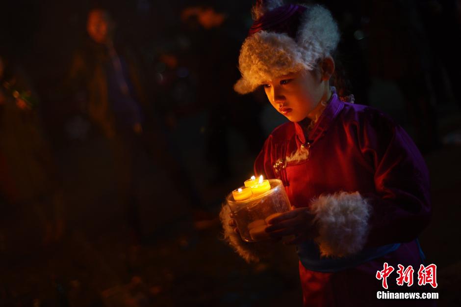 2月1日,拿着蜡烛的蒙古族孩子围绕火堆行走。当日是蒙古族传统祭火的日子,呼和浩特的许多蒙古族民众拿着准备好的奶制品、白酒等祭品,聚集在一起,围绕火堆行走,祭火祈福。中新社记者刘文华 摄