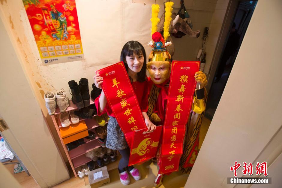 猴年新春佳节日益临近,中国各地以“猴”元素为主题的活动,也逐渐增多。2月3日,山西太原,某电商的快递员纷纷化身为“美猴王齐天大圣”为民众们送起了快递。张云摄