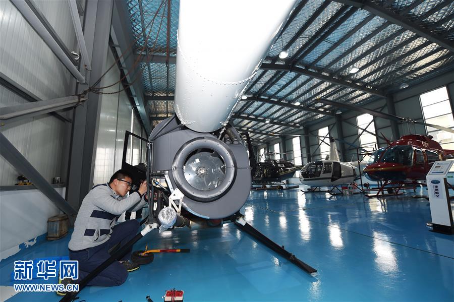 3月23日,宁波捷德航空·易达中心技师在机库内为一架罗宾逊R44雷鸟直升机做维修保养。