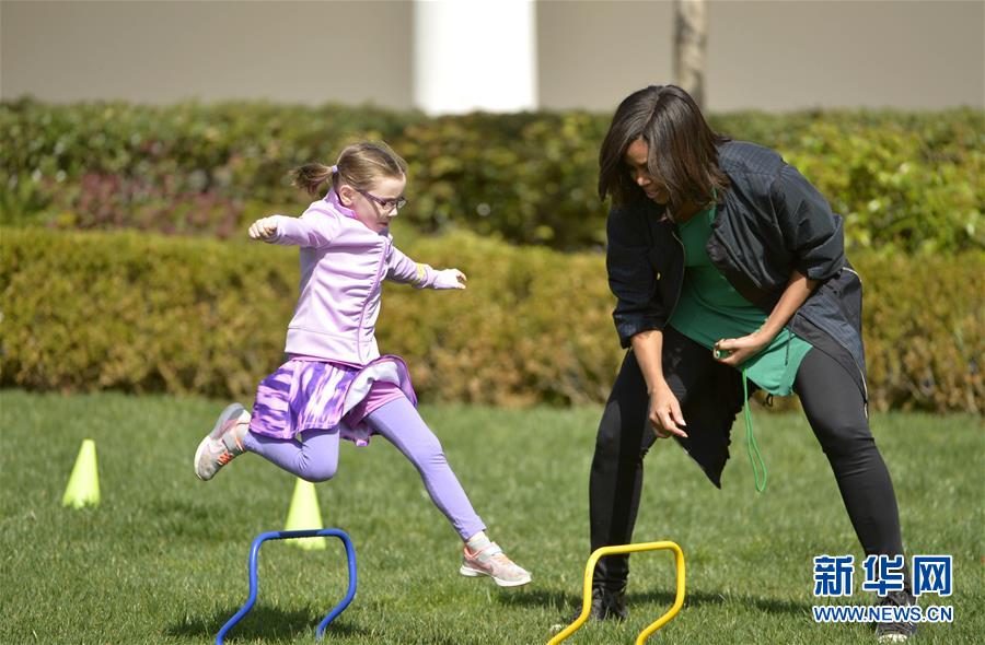 3月28日,在美国首都华盛顿的白宫南草坪,美国第一夫人米歇尔·奥巴马(右)和孩子做接力跑游戏。当日,一年一度的复活节滚彩蛋活动在白宫南草坪举行,三万多名民众参与了滚彩蛋、读书、体育比赛、歌舞表演等活动。新华社记者殷博古摄