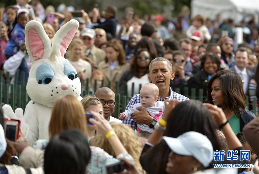 3月28日,在美国首都华盛顿的白宫南草坪,美国总统奥巴马参加滚彩蛋活动。当日,一年一度的复活节滚彩蛋活动在白宫南草坪举行,三万多名民众参与了滚彩蛋、读书、体育比赛、歌舞表演等活动。新华社记者殷博古摄