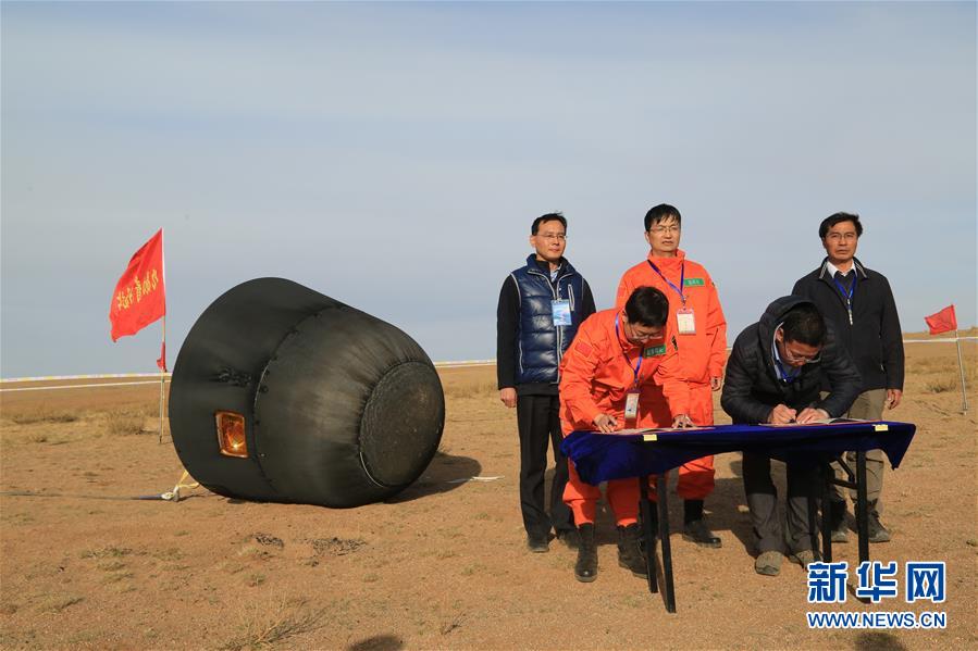 4月18日,工作人员在回收现场进行返回舱签字交接。当日,顺利完成12天太空飞行后,中国首颗微重力科学实验卫星——实践十号返回式卫星回收舱16时30分准确降落在内蒙古四子王旗预定着陆区域。回收舱着陆状态正常、外观良好,卫星搜索回收任务顺利完成。新华社发(蔡新敏摄)