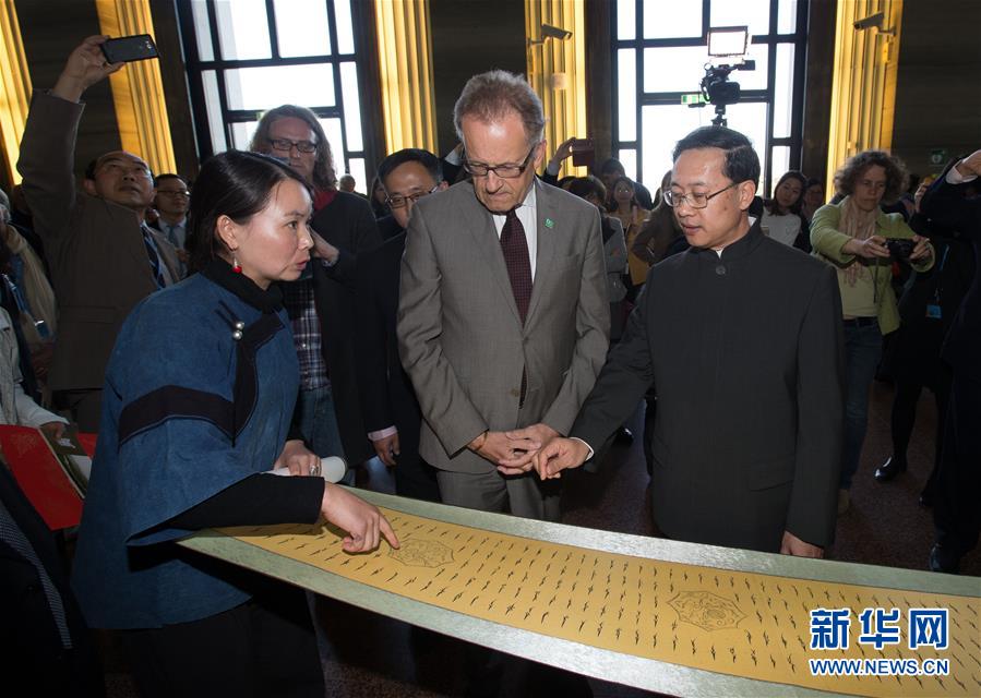 4月19日,在瑞士日内瓦联合国万国宫,中国“女书”传人胡欣(左一)向联合国日内瓦办事处总干事穆勒介绍用“女书”书写的《世界人权宣言》。一种脱胎于方块汉字、却只有居住在中国湖南部分山区的妇女能够识别的文字——“女书”,19日走进联合国日内瓦办事处所在地万国宫,开始为期9天的展览,以此纪念第七个“联合国中文日”。新华社记者徐金泉 摄