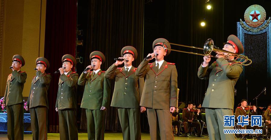 朝中社4月25日提供的照片显示,朝鲜人民军协奏团25日在朝鲜平壤烽火艺术剧场举行音乐舞蹈综合演出,庆祝朝鲜人民军建军84周年。新华社/朝中社
