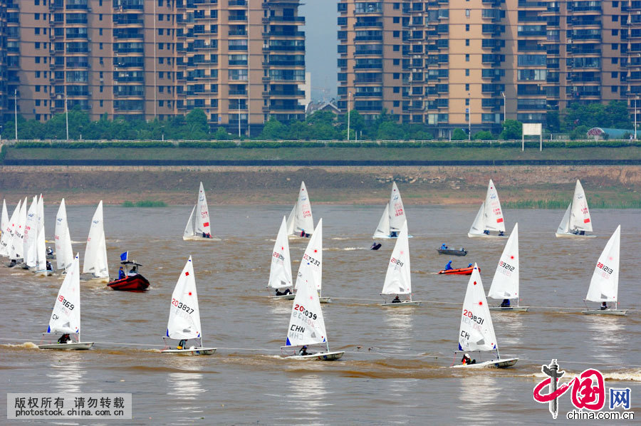 4月28日,2016中国长沙湘江杯国际帆船赛暨长沙湘江水上嘉年华在长沙橘子洲开幕,比赛船只在湘江上航行,展现了百舸争流的壮观景象。中国网图片库 何东平摄影