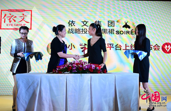 本次奢瑞春季大秀结束后,依文集团旗下小礼服品牌与奢瑞小黑裙达成品牌战略合作伙伴关系。图为签约仪式。