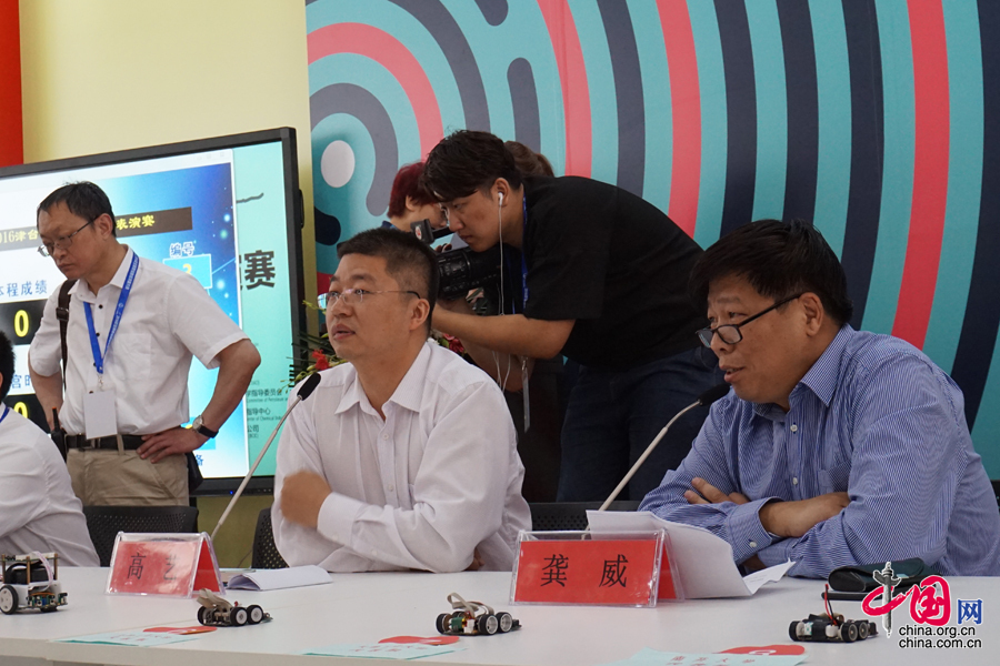 5月9日,2016津台”电脑鼠走迷宫表演赛在天津渤海职业技术学院举行。图为表演赛解说嘉宾。摄影/佟静