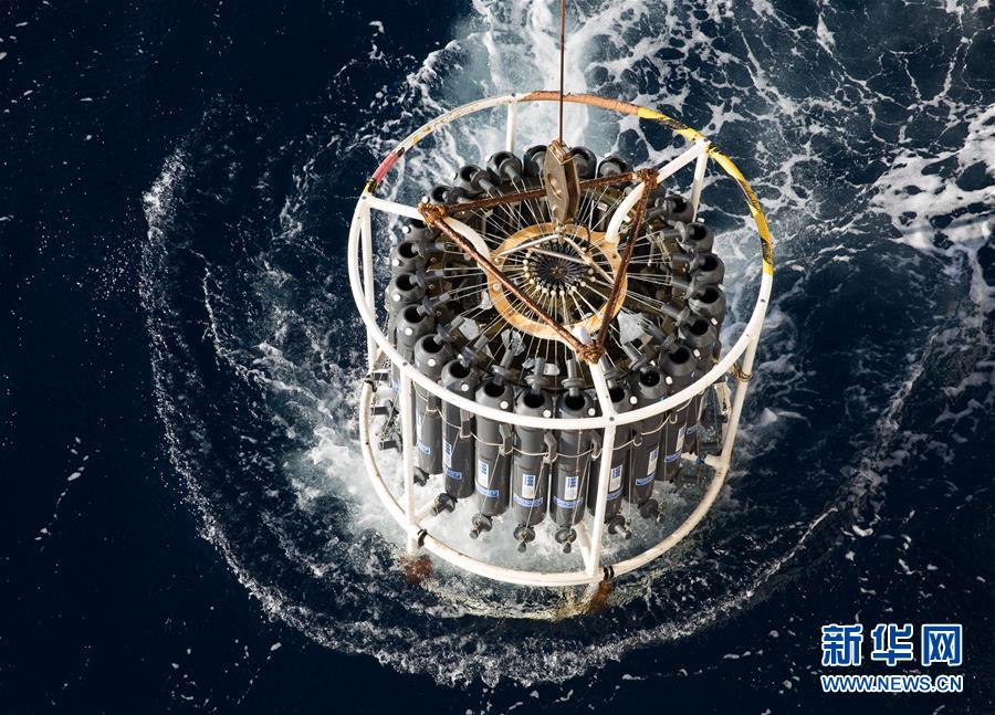 5月12日,科考队员在后甲板将CTD系统投放入水。新华社记者 金立旺 摄